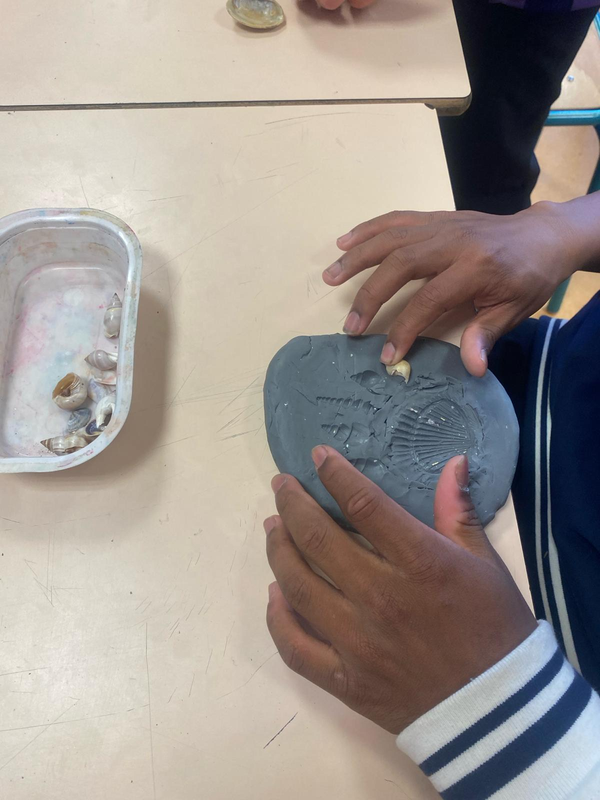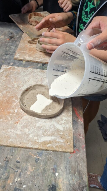 Les élèves ont ajouté des bordures autour de leur empreinte pour en faire des moules, ils ont ensuite coulé le plâtre dedans.