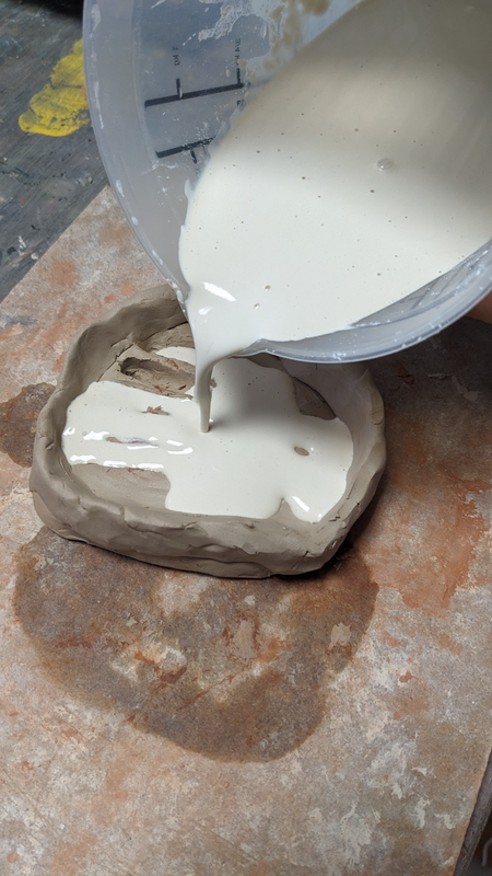 Remplissage des moules en argile avec du plâtre.